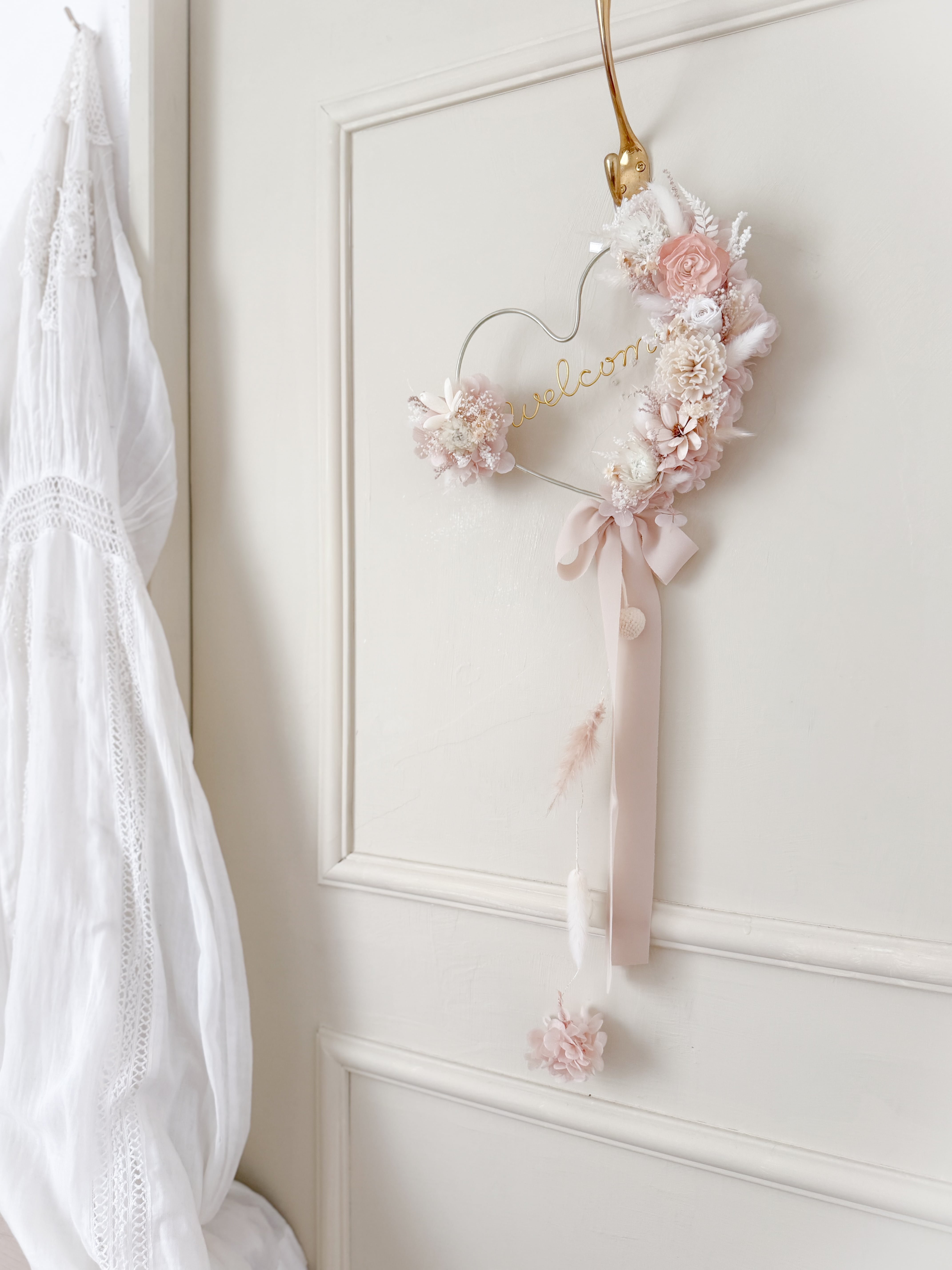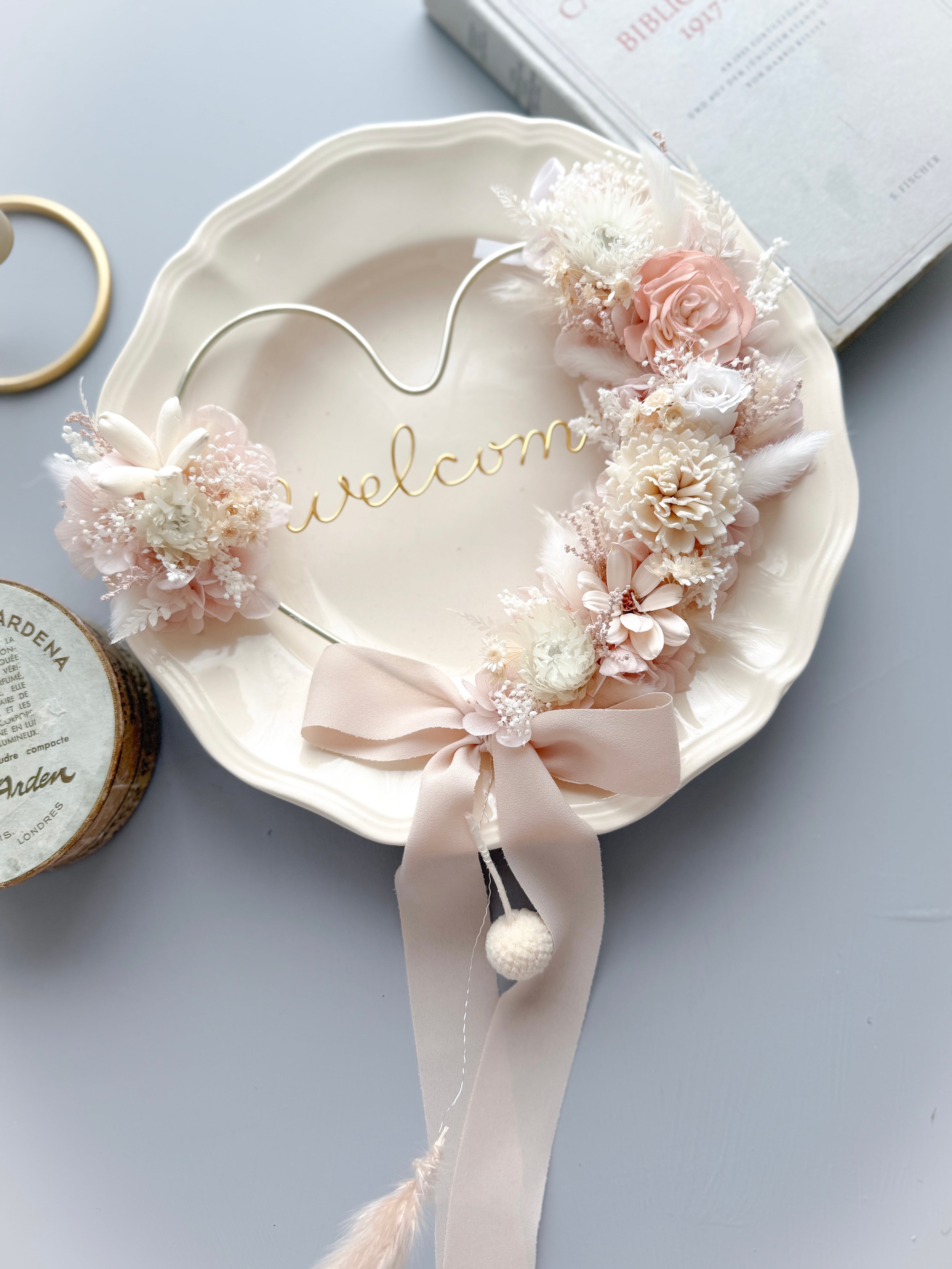 優しいピンク系でまとめた、ハートのwelcomeリースです。
