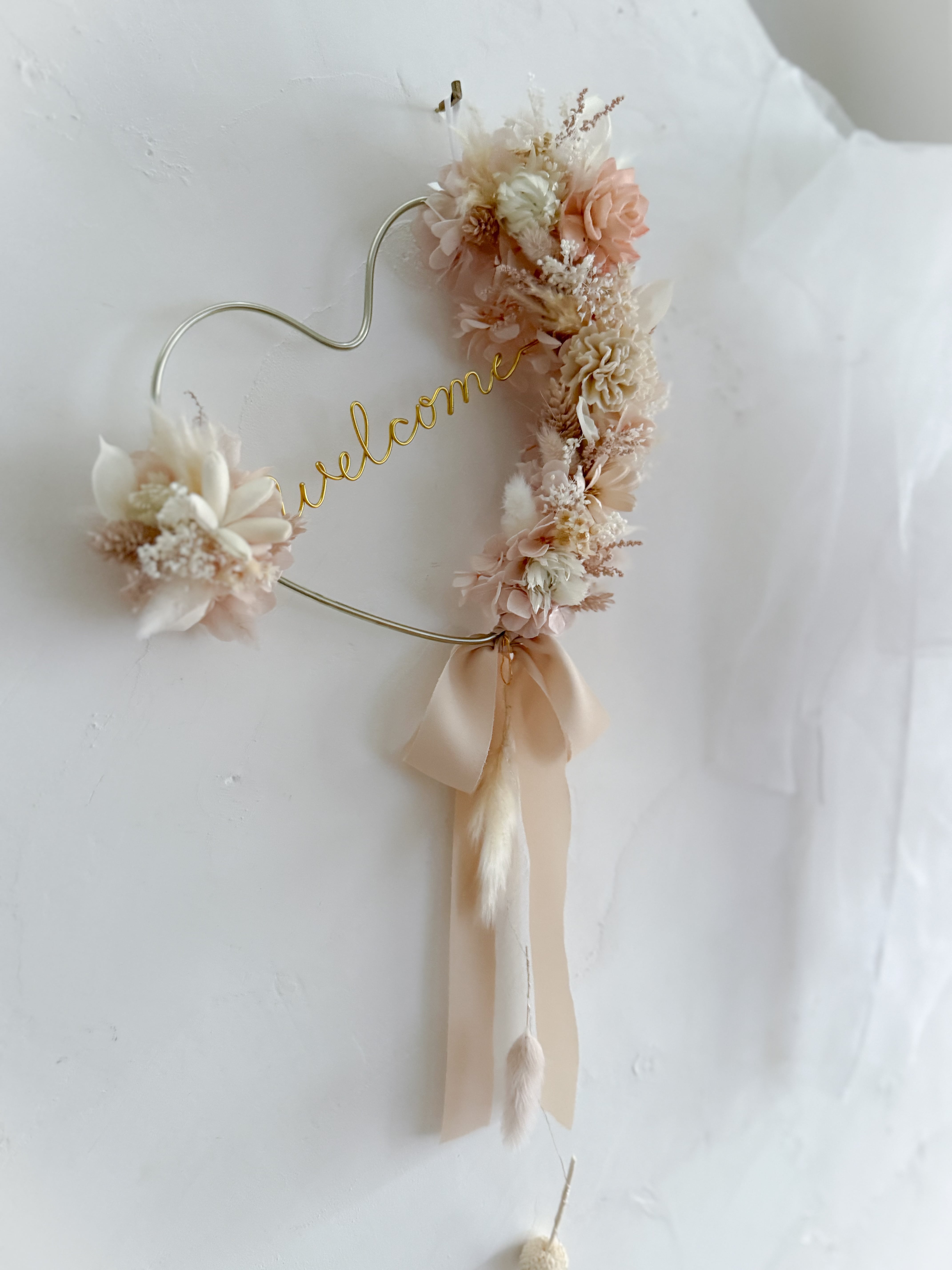 優しいピンク系でまとめた、ハートのwelcomeリースです。