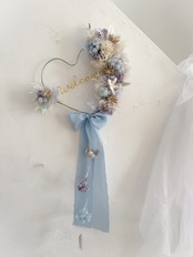 ブルー、グレー、パープル系でまとめた、ハートのwelcomeリースです。
