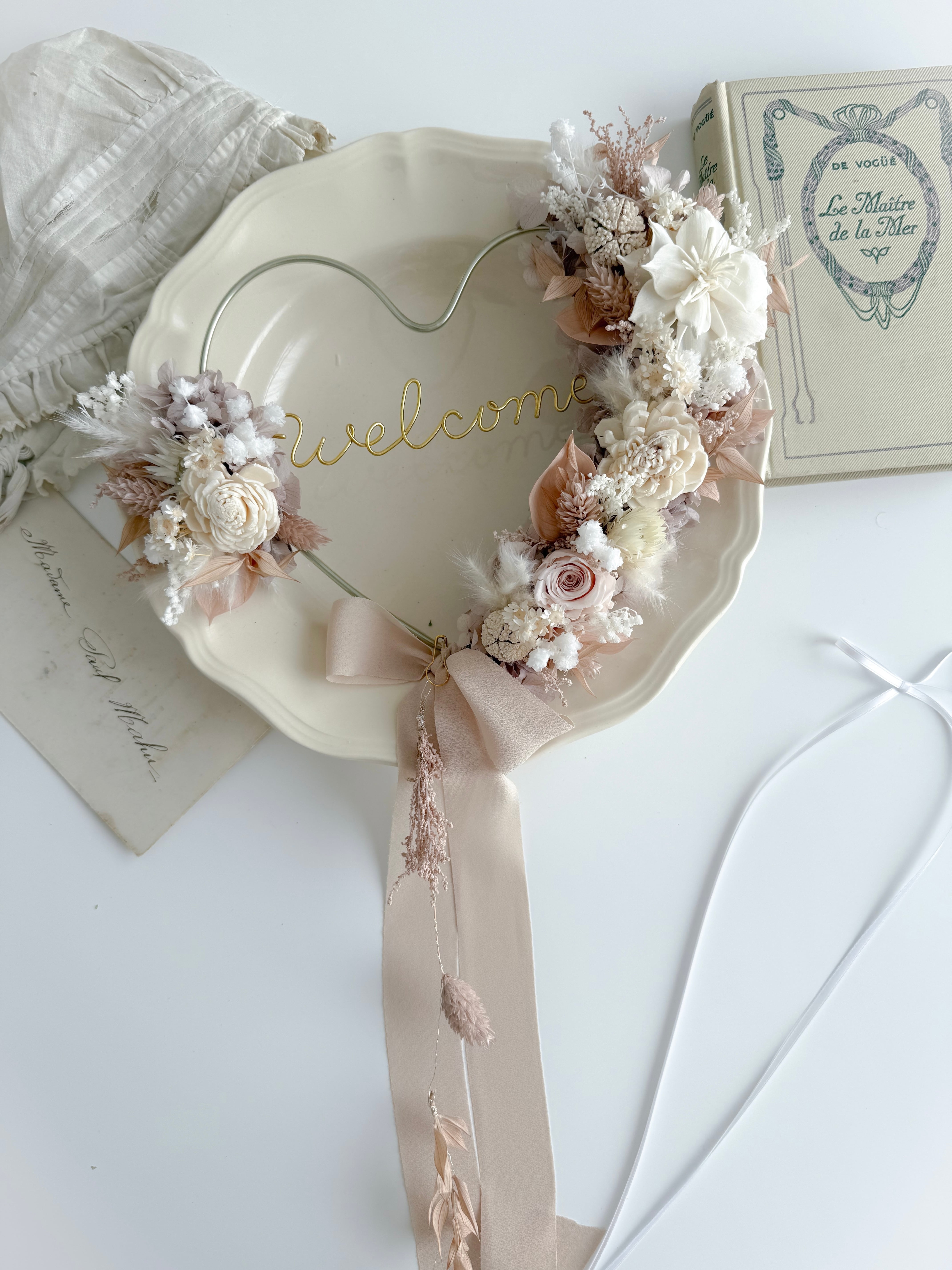 くすみピンク、ホワイト、くすみパープルのお花を合わせた、ハートのwelcomeリースです。